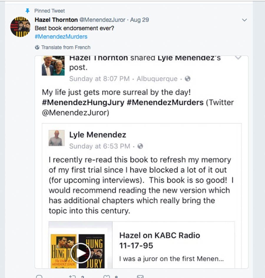 In an email to editor-in-chief Matthew Steeples, a juror in the first case brought against Erik Menéndez and author of Hung Jury: The Diary of a Menendez Juror Hazel Thornton remarked: