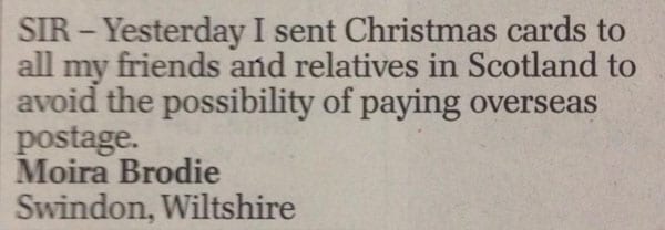 “Yesterday I sent Christmas cards to all my friends and relatives in Scotland to avoid the possibility of paying overseas postage”.