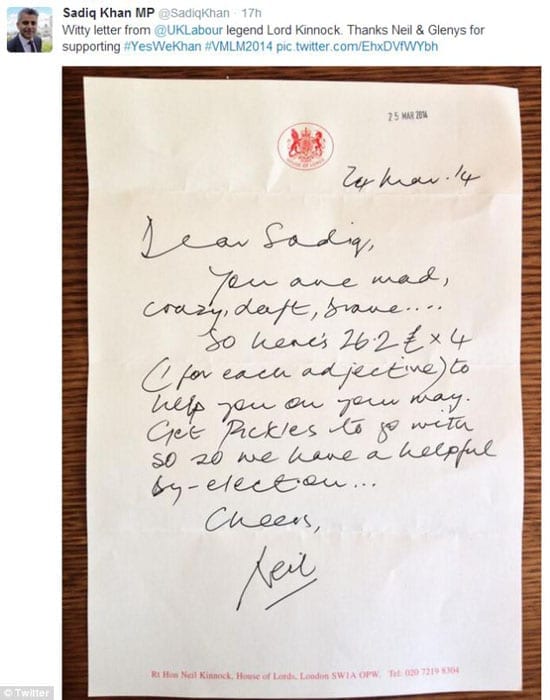 “Dear Sadiq. You are mad, crazy, daft, brave… So here’s 26.2£ x 4 (1 for each adjective) to help you on your way. Get Pickles to go with so we have a helpful by-election…. Cheers, Neil”.