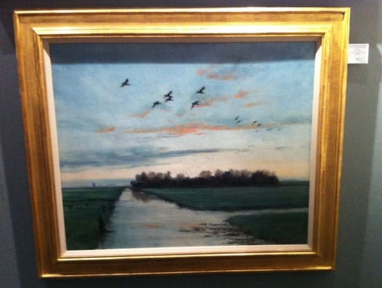 A highlight for anyone interested in nature is most certainly an oil on canvas by Sir Peter Markham Scott (1909 – 1989). Captioned “Ducks returning the decoy at daybreak” and painted by the son of the explorer Sir Robert Falcon Scott (1868 – 1912), this painting is priced at £16,000 available through Rountree Tryon Galleries. Sir Peter Scott was “one of the most versatile Englishmen of his generation, being an accomplished artist, naturalist, international sportsman, conservationist and man of action”. Amongst his achievements were to rescue the Hawaiian Goose from extinction. If only there were more like him today.