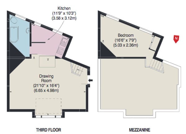 As eccentrically shaped as the 19th century building in which it sits, the top floor flat on offer was originally an artist’s studio and now features a double height reception space with a kitchen and bathroom to the rear and a bedroom on a mezzanine level. It totals just 603 square foot in size but is described as having “commanding views over the square and towards the Victoria & Albert Museum”.