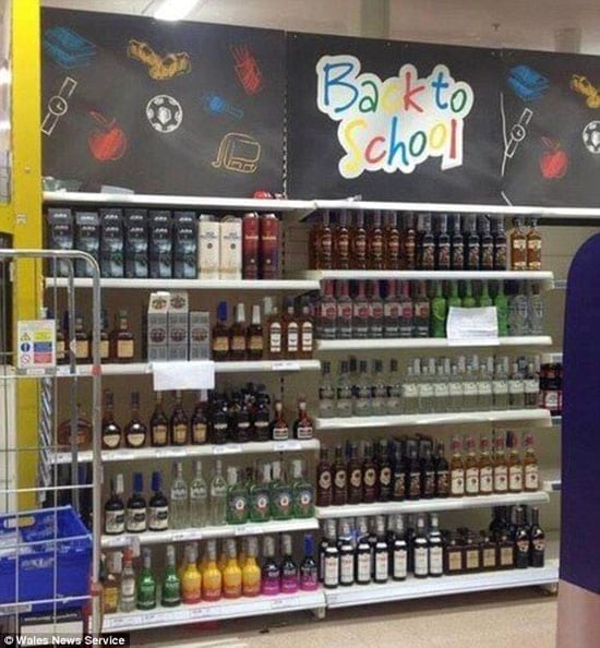 Shoppers at Tesco in Fforestfach, Wales were controversially confronted by a display of gin, vodka and whisky complete with a “Back to School” sign in recent days.