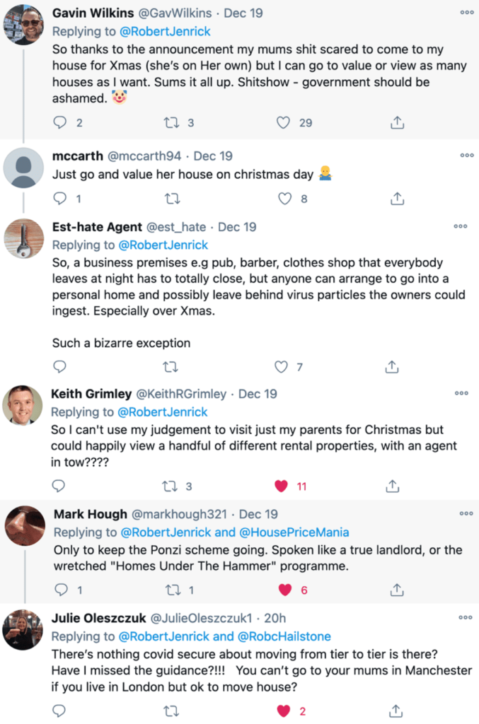 Whilst the public are cruelly banned from going to a socially distanced restaurant space or from having dinner with their lonely granny in her kitchen because of the risk of spreading coronavirus, how is it acceptable for estate agents to be allowed to take members of the public into the private spaces of peoples’ homes for viewings?