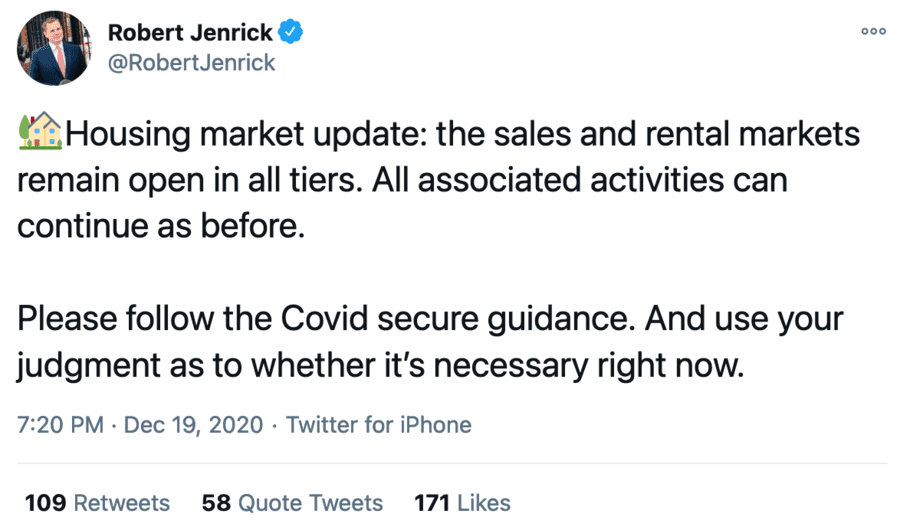 Pictured top: Disgracefully, Robert Jenrick MP and his government have not made property viewings a “restricted zone” in Tier 4 lockdown areas.