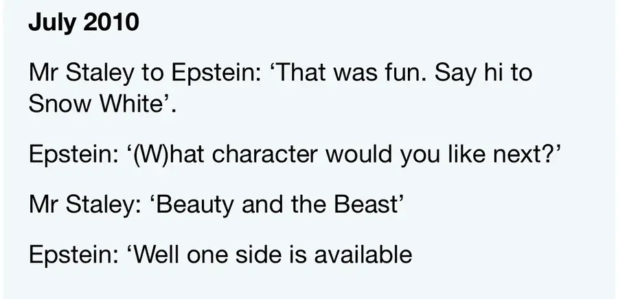 “Previous lawsuits have shown Mr Staley and Epstein exchanged hundreds of emails and text messages over the years, and they were seen to have a close relationship that went beyond the professional relationship a banker would have with a wealthy client.”