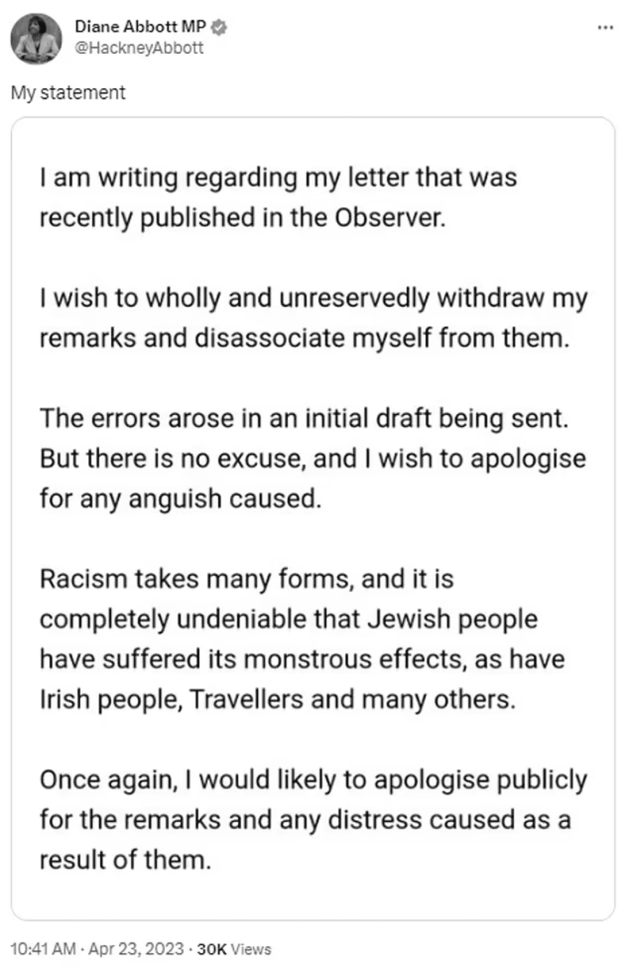 If the far-left fanatic Diane Abbott MP were an ordinary citizen, she would not get away with the disgraceful words she used against Irish, Jewish, Traveller and reheaded people in a recent letter to The Observer.