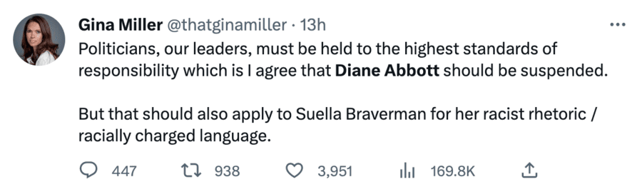 “Politicians, our leaders, must be held to the highest standards of responsibility which is I agree that Diane Abbott should be suspended. But that should also apply to Suella Braverman for her racist rhetoric/racially charged language.”