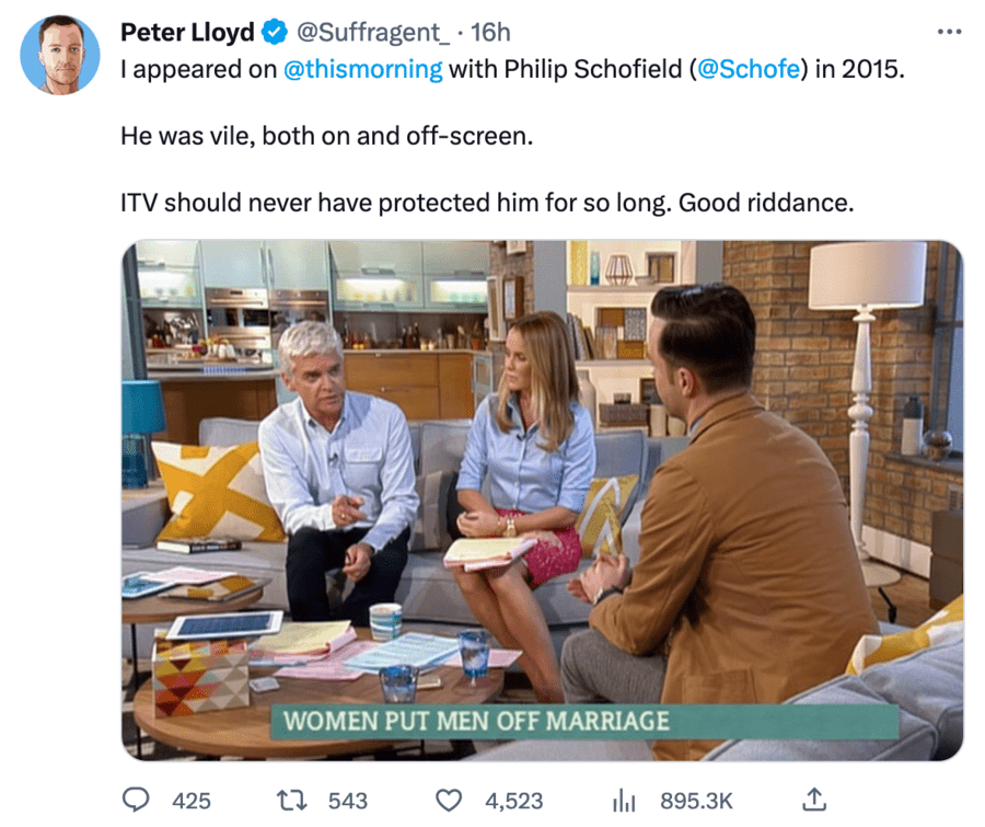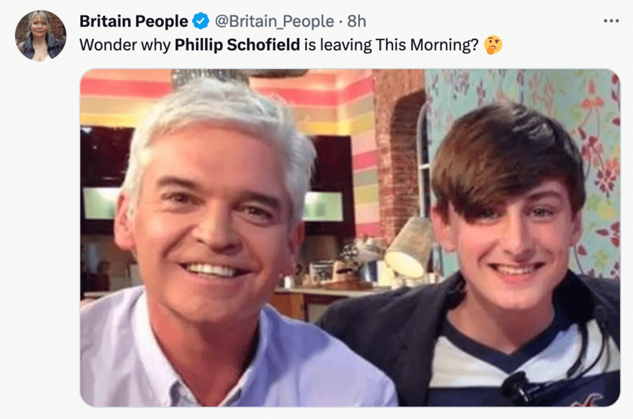 After several weeks of the story not being about This Morning itself, but instead swirling around Phillip Schofield’s policeman-turned-nonce brother, Timothy, being sent down for twelve years, Willoughby refusing to speak to him off screen and allegations concerning a runner whom the presenter met when he was just thirteen, this became an out of control juggernaut that just had to be stopped.