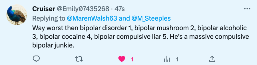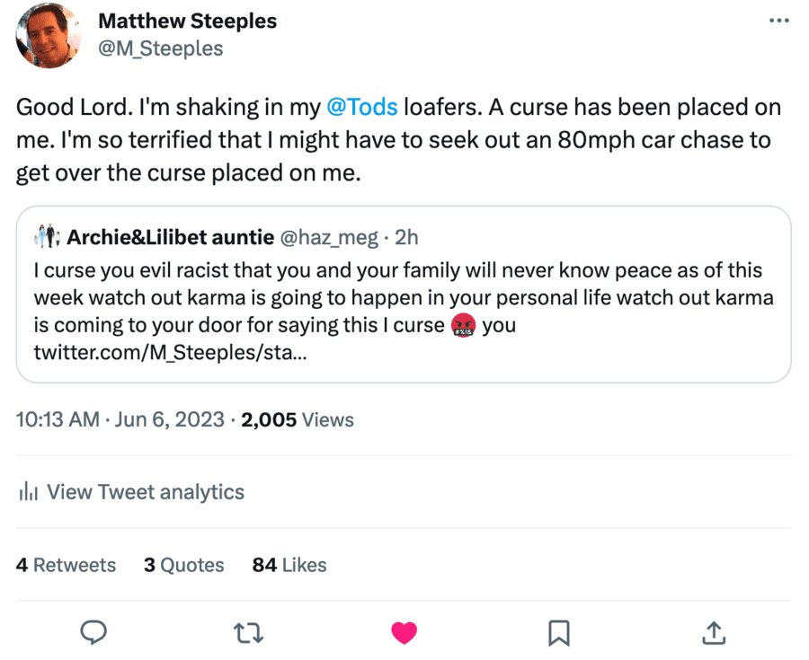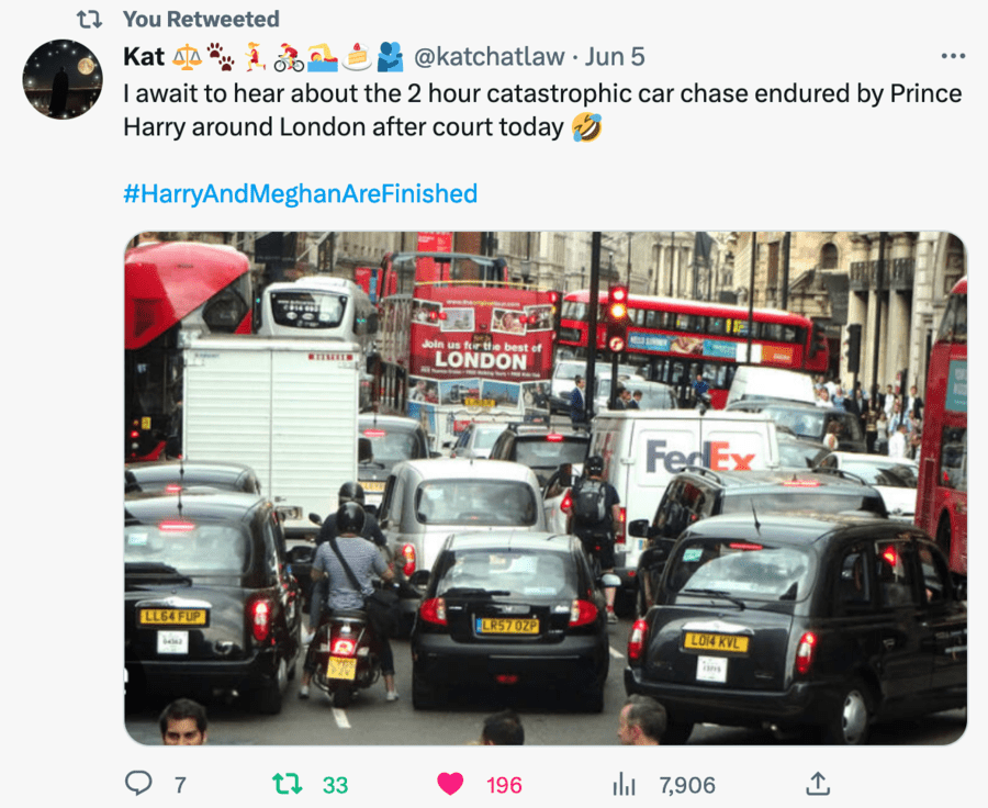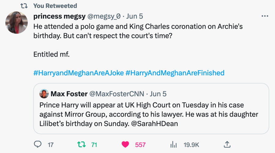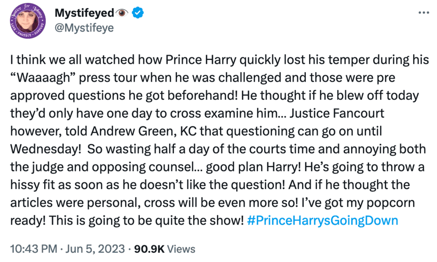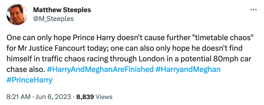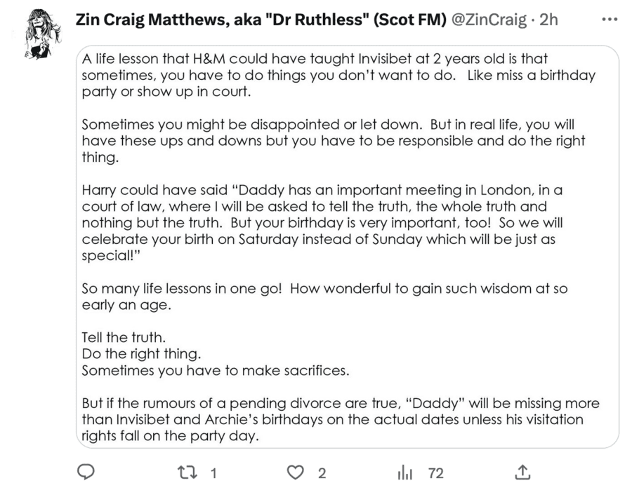 Supporters of the magic mushroom, cocaine and booze loving renegade royal, however, took great umbrage at the jovial jester outside the court house. One especially delusional example – supposedly called ‘Maya’ and tweeting under the handle @franzicake – raged: “Surely this is causing civil arrest? Arrest [the artist] like the police did with the anti-King Charles III placard holders. #PrinceHarry #CharlesTheCruel #racistroyalfamily #WeStandWithPrinceHarry.”