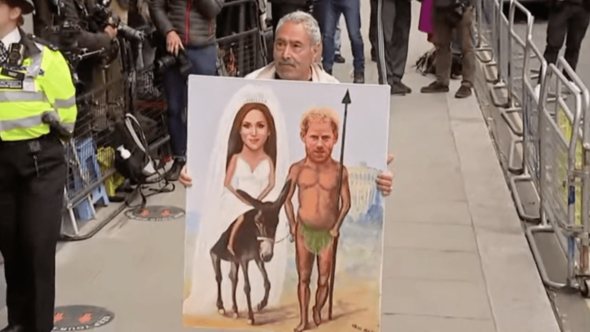 Also joining the merry ‘throng’ he so loves to hate, an elderly gentleman paraded up and down with a canvas. It was presumably painted by his very own fair hand and featured the mendacious menace formerly known as Meghan Markle depicted as a woman in a wedding dress on a donkey. Accompanying this total ‘ass’ in an image that wouldn’t look out of place for sale on the railings of Green Park on a soggy Sunday, hapless hubby was shown shoeless, in a loin cloth and wielding a spear.