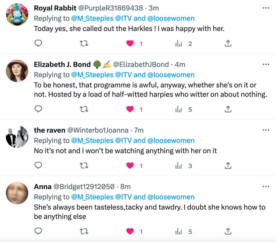 Loose Women, as I pointed out back in September 2018, is an ITV1 programme that “celebrates all that is toxic about womankind.” If a male equivalent existed and was called Misogynist Men, there would be public uproar, but that a collection of hideous harpies including the likes of Tamara Ecclestone, Judy Finnigan and Katie Price are allowed to behave like braying banshees during family viewing hours is frankly scandalous.