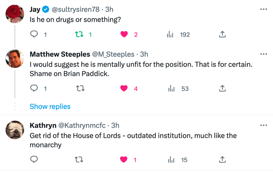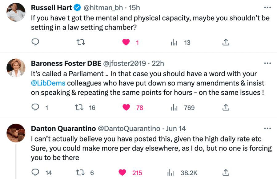 Others, going further added: “Cry me a river!” whilst one, going by the name Jay, raged of a man known for somewhat curious views on narcotics: “Is on he on drugs or something?” Clearly illustrating that Lord Paddick – whom took a fee of sum unknown from The Mail on Sunday in February 2023 and also recently declared a contact with the “Are you OK?” folk at ITV Studios – has made an utter berk of himself, another, Russell Hart, pointedly added: “If you haven’t got the mental and physical capacity, maybe you shouldn’t be sitting in a law setting chamber.”