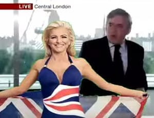 Gordon Brown and Michelle Mone in parody accompanied by the music of The Benny Hill Show