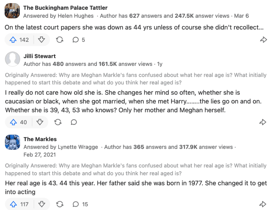 Described as “having a very conflicted relationship with the truth” on many matters on Quora and accused again this week by crusading author Kirby Sommers of having met Prince Andrew and his since croaked paedophile mates Jeffrey Epstein and Ghislaine Maxwell prior to hooking up with Prince Harry, here is a woman whose age is estimated as high as 46 – five years older than she herself claims.