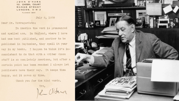Whether this argumentative author subsequently made an “arse” or an “ass” of himself with his bosses remains unknown, but one thing is for sure, John O’Hara considered Americans above Brits to the end. In 1952, he concluded: “Sometimes I almost feel that I ought to apologize [sic] for having the ability to write good dialogue, and yet it’s the attribute most lacking in American writers and almost totally lacking in the British.”