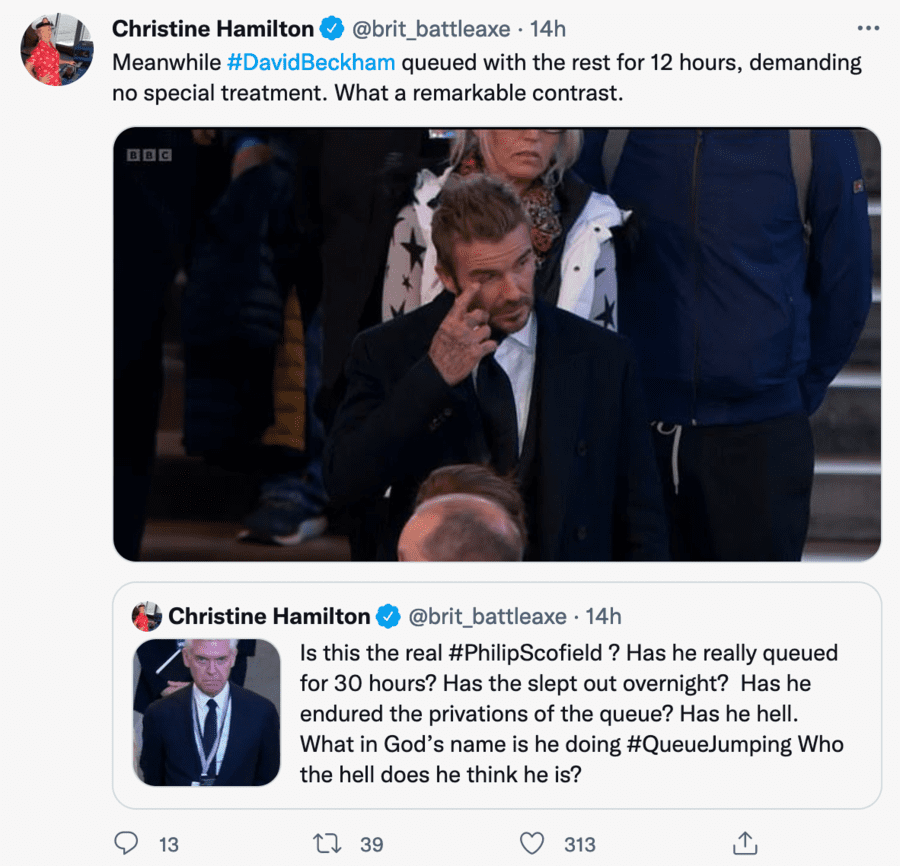 “Holly Willoughby and Phillip Schofield, two hosts of one of the most damaging to mental health day time TV shows This Morning, were able to push past those thousands and get immediate access [those waiting to pay their respects to the late Queen].”