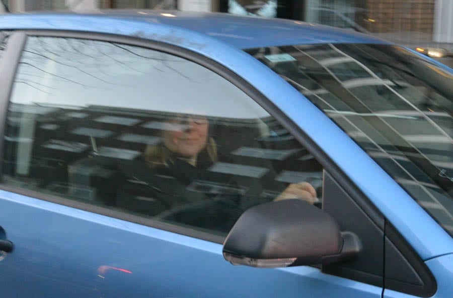 parks her car with the diesel engine pumping out fumes and knowing that idling engines push out 50% more particulates than a car in motion