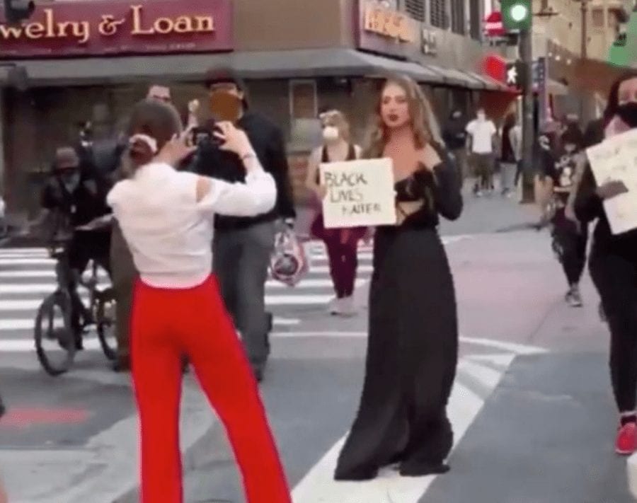 “Stop treating the protests like Coachella pt. 17” raged ‘Influencers in the Wild’ of a white woman posing for her personal photographer with a ‘Black Lives Matters’ sign on a Zebra crossing. She was wearing what The Independent far too generously termed a “black floaty gown” in a video of the incident, posted on Twitter on Friday.