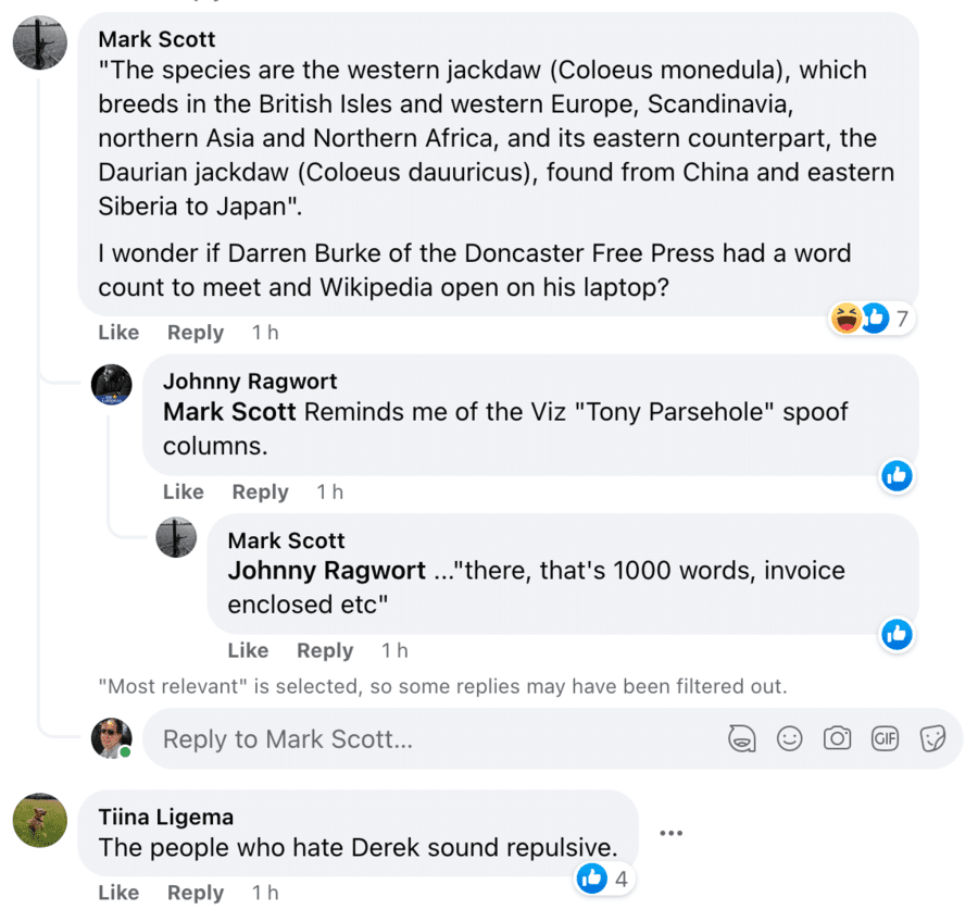 As residents of a village near Doncaster call a jackdaw named ‘Derek’ “horrible” and a “menace,” Facebook’s ‘Angry People in Local Newspapers’ group unsurprisingly tear these nasty NIMBYs apart