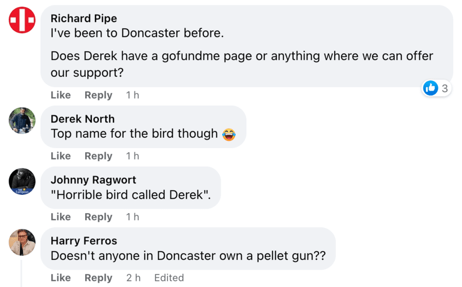 The bird in question – which has, for some unknown reason, been named ‘Derek’ – was featured on the Facebook group ‘Angry People in Local Newspapers’ [APILN] today after the Doncaster Free Press’s Darren Burke reported that locals have decided “the thing is a menace” earlier this morning.