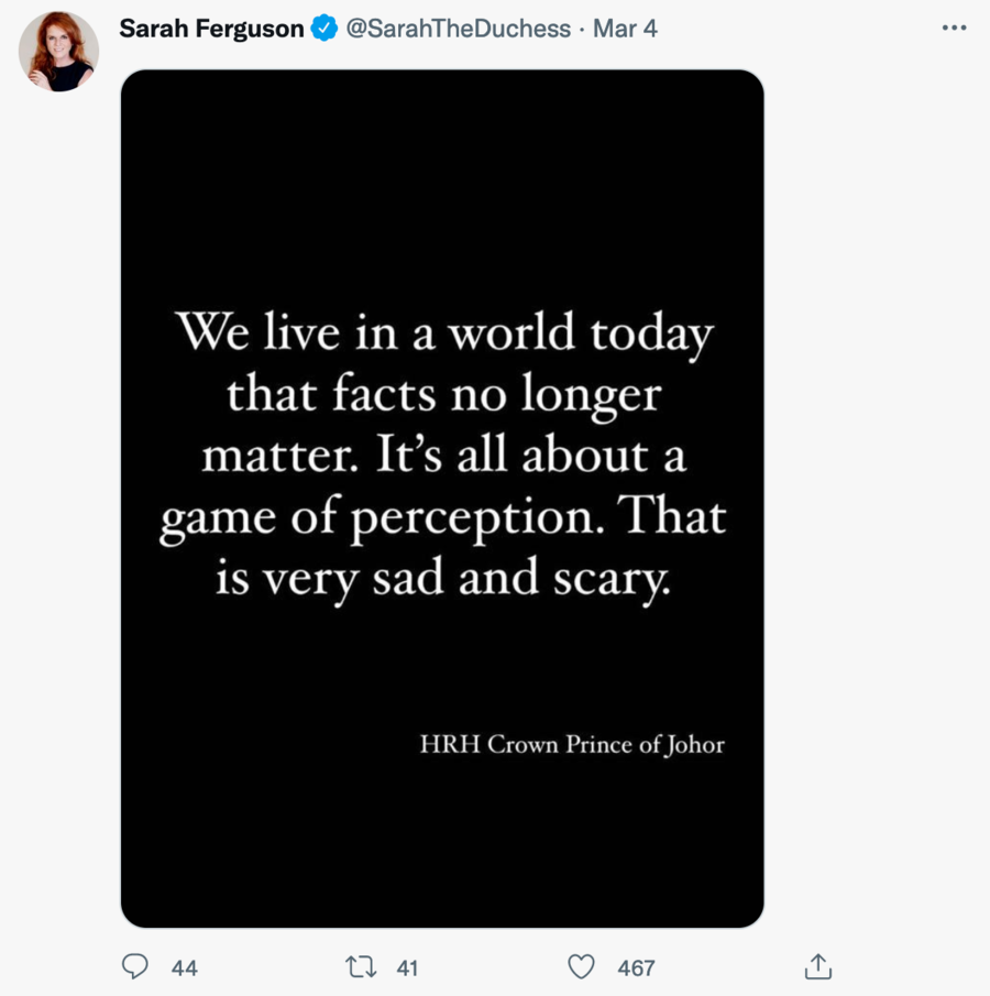 Instead, aside from embarking on a road trip across America peddling her tepid wares, Prince Andrew’s somewhat simple sidekick took to Twitter to share a quote attributed to HRH Crown Prince of Johor. It read: “We live in a world today that facts no longer matter. It’s all about a game of perception. That is very sad and scary.”
