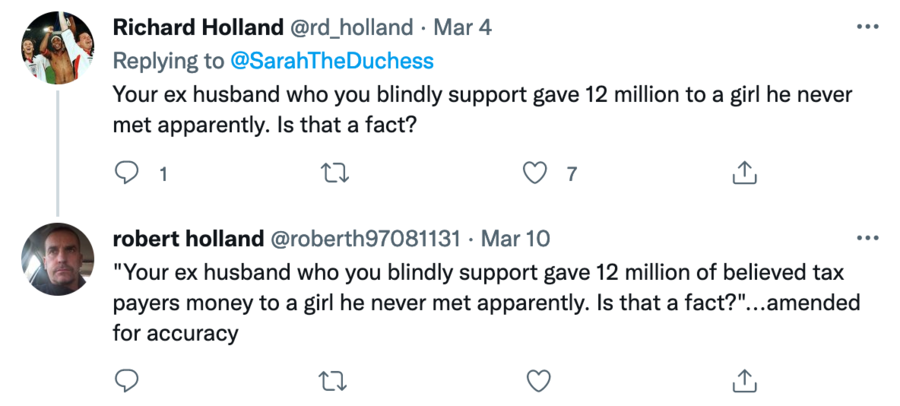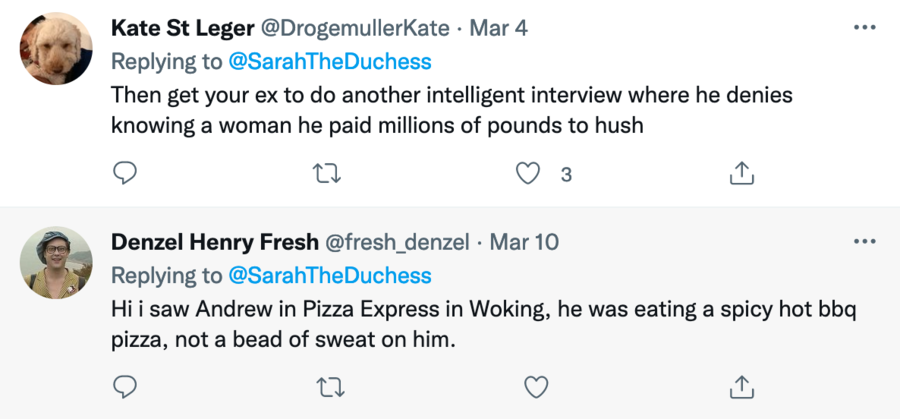 As of date, the mother of Princesses Beatrice and Eugenie hasn’t followed up with a tweet about the fact that she took a loan from the since croaked paedophile Jeffrey Epstein and never confirmed whether she repaid that. Unsurprisingly also, she hasn’t had a response yet from Virginia Roberts Giuffre confirming the fact that she clearly did have not-so-royal relations with the Duke of York at Ghislaine Maxwell’s Belgravia bonk pad on 10th March 2001.