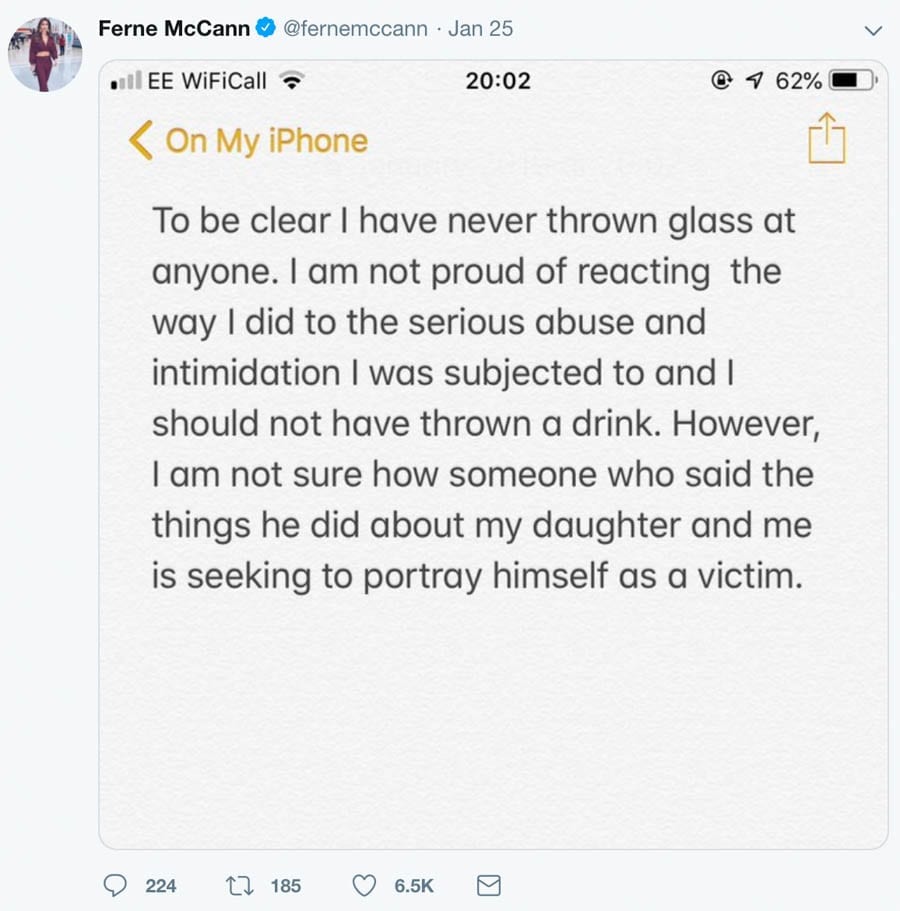 During the attack, Ms McCann – a tawdry fishwife-like woman whose ‘fame’ stems from stints on such drivel as TOWIE, Loose Women and This Morning – also supposedly shoved a plastic cup containing the liquid in the face of her victim, Love Island participant Adam Collard.