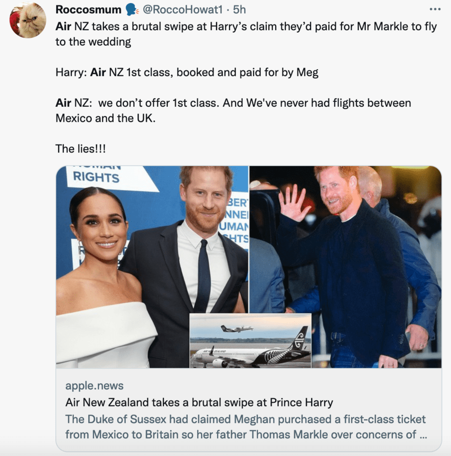 Air New Zealand call out Prince Harry’s lies about bookings to fly Thomas Markle and again illustrate that him and ‘Mendacious Meg’ find the truth highly inconvenient