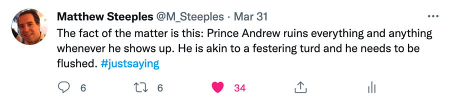Shame on Prince Andrew and shame on those that continue to enable this festering turd by continuing to give him such significant chunks of change.