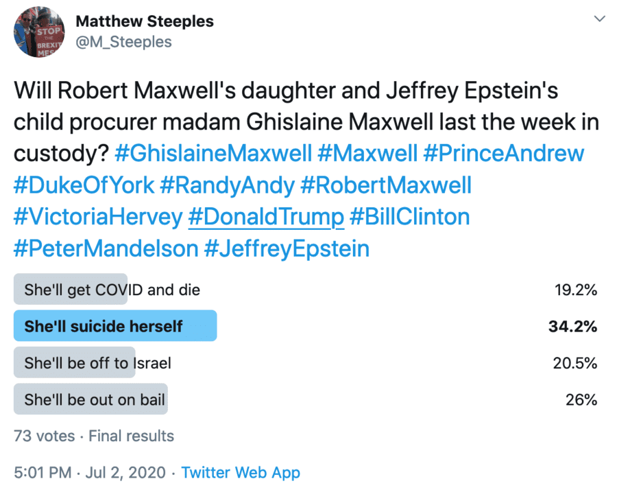 Though one thing is for sure and that is that Ghislaine Maxwell will not be returning to her 156 acre “retreat” in Bradford, New Hampshire this weekend, a Twitter poll conducted by The Steeple Times’ Matthew Steeples has revealed that the public believe she’ll go the same way as Jeffrey Epstein.