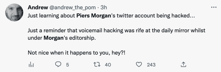 The scourge of the red tops that is the actor Hugh Grant tweets from the handle @HackedOffHugh and ironically last night, one of his favourite targets, Piers Morgan – who formerly worked at papers that most definitely engaged in phone hacking – literally found himself hacked also.