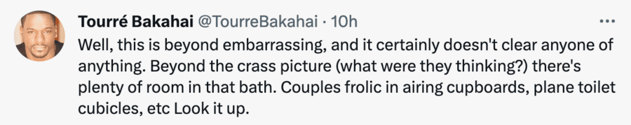 “I am releasing my photos now because the truth needs to come out. They show the truth that the bath is too small for any sort of sex frolicking.”
