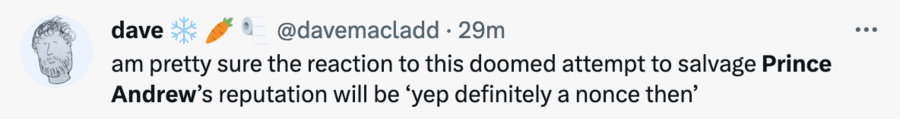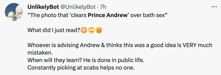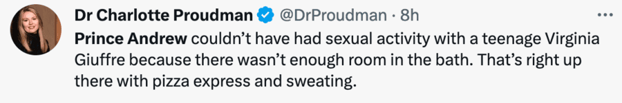 This morning on Twitter, Matthew Steeples asked: “Why is Ian Maxwell, brother of Ghislaine Maxwell, trying to make out that the bathtub at her former home at 44 Kinnerton Street, Belgravia too small for Prince Andrew & Virginia Roberts Giuffre to have had sex in? I proved it was of normal size last year.” The majority of respondents thus far have taken the view that “he’s working for Prince Andrew.”