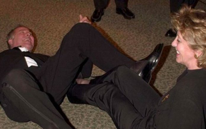 Pictured top: Michael Barrymore and helmet haired horror and convicted drunken racist Marie Claire, Baroness von Alvensleben rolling around on the floor at a charity event in 2000..