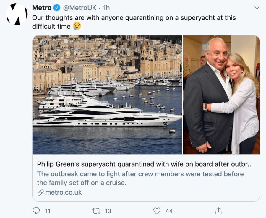 The world said “diddums” for Sir Philip Green and his ludicrously wealthy, tax minimising wife Tina today with news that the couple cannot take their £100 million gin palace on a “family cruise” due to two staff onboard testing positive for coronavirus.