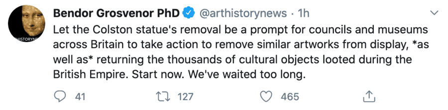 “Let the Colston statue’s removal be a prompt for councils and museums across Britain to take action to remove similar artworks from display, *as well as* returning the thousands of cultural objects looted during the British Empire. Start now. We’ve waited too long.”