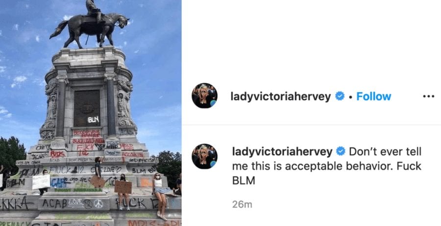Formerly nicknamed ‘Toff Totty Vicky,’ Lady Victoria predictably showed herself up by banging on about her associations with Jeffrey Epstein and Ghislaine Maxwell last year. This weekend, the bubbly blonde went further in posting a picture of the defaced statute of the Confederate general Robert E. Lee in Richmond, Virginia on her Instagram page. She not-so charmingly captioned the snap: “Don’t ever tell me this is acceptable behavior [sic]. Fuck BLM [Black Lives Matter].”