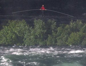Yesterday, Wallenda crossed Niagara Falls on a steel wire weighing 7 tons that had a diameter of 2 inches. It was installed by helicopter and pulled across the gorge by machines and to cross it, Wallenda carried a 30ft balance pole weighing some 40 pounds. His achievement was spectacular to watch and in this age of austerity, it is fantastic to have witnessed something so positive.