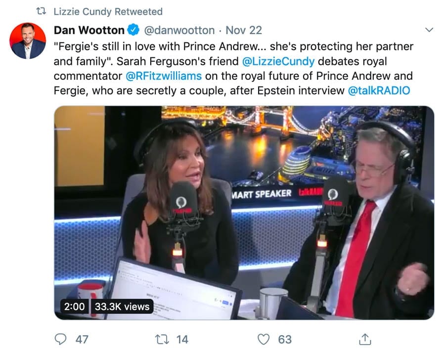 A publicity obsessive turned “jilted friend” of the former Meghan Markle has struck again. In comments to The Sun, the fan of ‘noisy secret sex” with Danny Cipriani that is Lizzie Cundy has spoken out in defence of Prince Andrew and her very own “pal,” the spendaholic that is Sarah, Duchess of York.