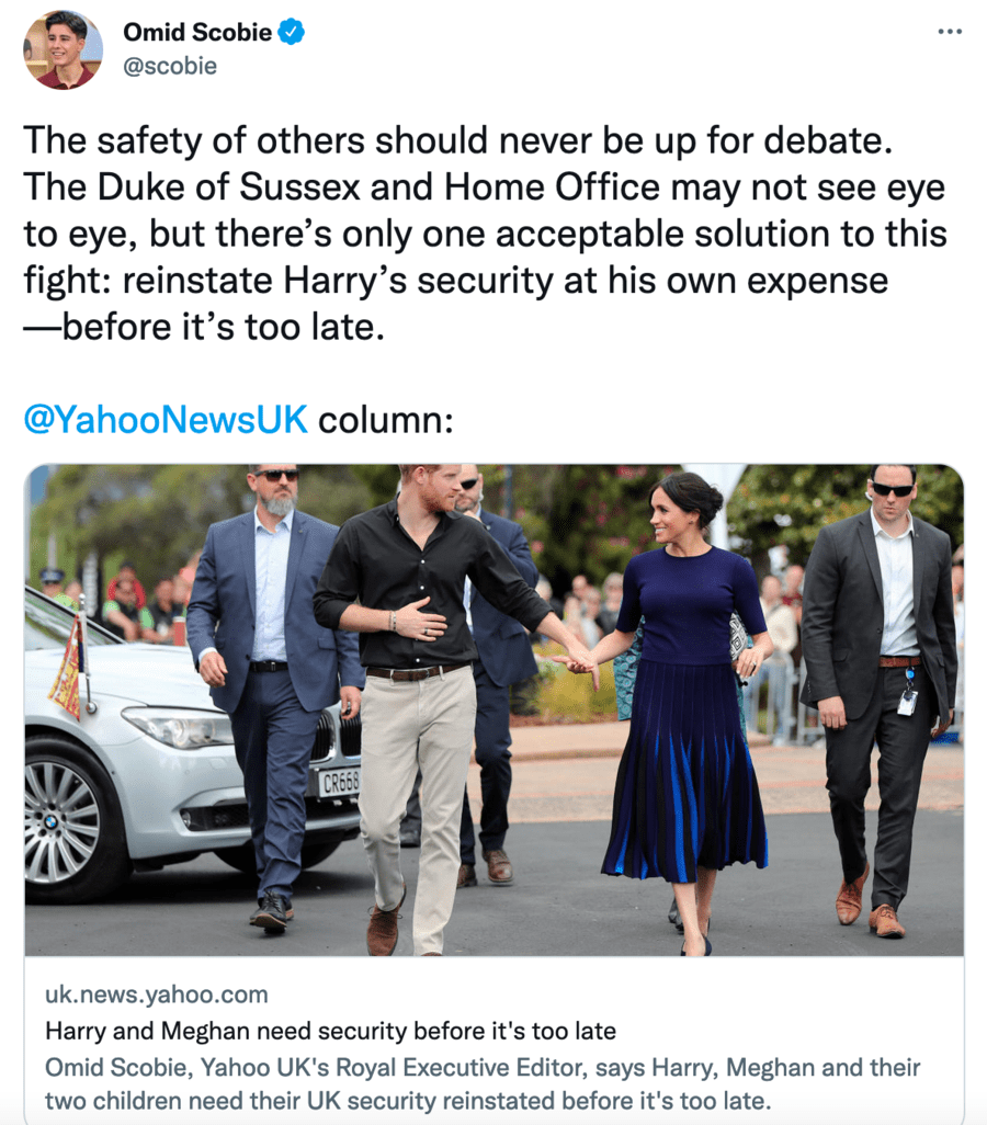 Unsurprisingly yet again showing himself as the ultimate example of such yesterday, the rotten-to-his-core PR peddler for the Duchess of Sussex that is the maniac Omid Scobie turned a story about who ought to pay for royal security into a fantasy about his worries about his own personal security.