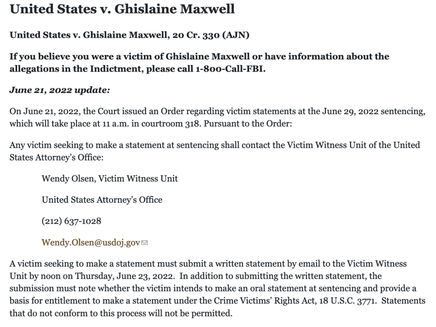 “Each of the six victims identified at trial – Jane, Annie, Kate,Carolyn, Virginia, and Melissa – has received funds from the Epstein Victim Compensation Fund and/or civil settlements as compensation for the harms they suffered as a result of the defendant’s and Epstein’s crimes.”