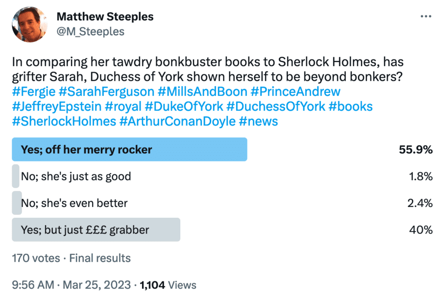 Given, after we asked: “In comparing her tawdry bonkbuster books to Sherlock Holmes, has grifter Sarah, Duchess of York shown herself to be beyond bonkers?” yesterday, 55.9% decided her to be “offer her merry rocker” and 40% argued her to “just £££ grabber,” the prospects of the dimwitted dunce Prince Andrew reaching the dizzy literary heights of Sir Arthur Conan Doyle seem equally grim. Instead, the Duke of York might do better to ask one of his few remaining chums, the awaiting a £400 million fraud trial dwarf Bernie Ecclestone, to bail him and ‘Freeloader Fergie’ out one more time.