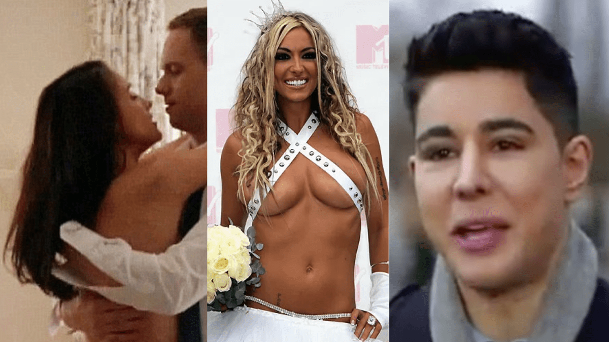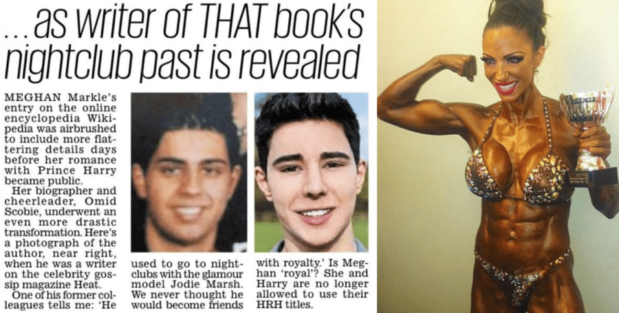 Pictured top (from left to right) – The Duchess of Sussex back in her days as a lowbrow actress in ‘Suits’ in a clinch with ‘co-star’ Patrick J. Adams; boob exposing ‘glamour model’ Jodie Marsh and PR peddling pillock Omid Scobie.