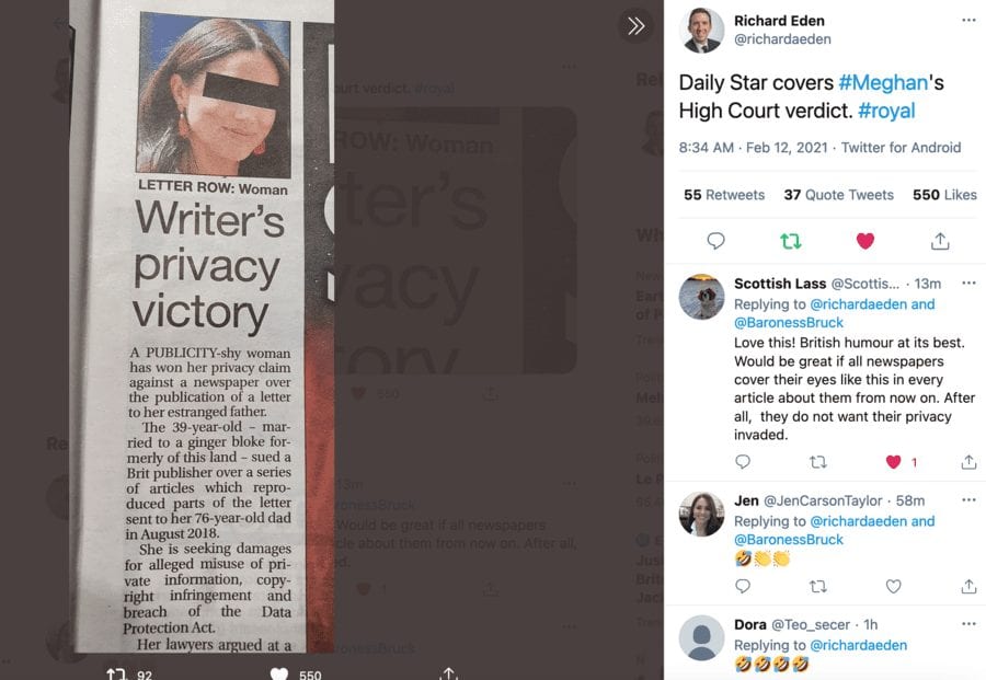 Yesterday, the Daily Mail’s Richard Eden tweeted to share the best of the coverage of the former Meghan Markle’s High Court victory over the very publication he works for.
