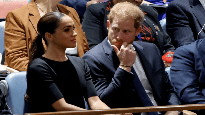 Pictured top – An especially unkempt and miserable looking Duke of Sussex at the United Nations in New York last week with his very ambitious crackpot wife sat alongside looking, as ever, as if she is the cat that well and truly got the cream.
