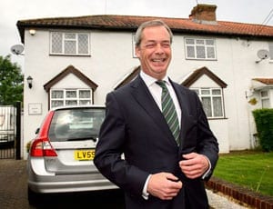 The image shows a jubilant Farage outside his Kent home just as it was announced he’d become the UKIP candidate for Thanet South at next year’s elections. Behind him is a Volvo estate car on a block-paved driveway, a caravan locked inside a gated compound, a Leylandii hedge and semi detached cottage complete with a satellite dish and twee leaded light windows. Here, indeed, is a picture of what Britain sadly has become.