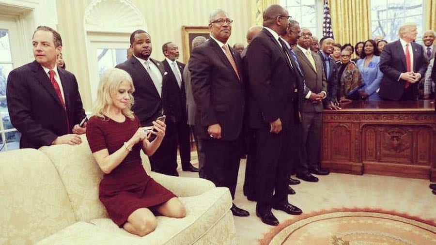 Yesterday, ‘Queen of Alternative Facts’ and expert on the non-esixtent ‘Bowling Green Massacre’ Kellyanne Conway illustrated another side to her character when she climbed onto a couch in the Oval Office and dug her heels into its delicate fabric.