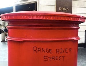 Our Picture of the Week, shared on Facebook by ‘Jeans Queen’ Donna Ida Thornton, founder of Donna Ida, shows a postbox outside the trendy restaurant Roka. It has been tagged “Range Rover Street” in black ink and certainly is not an unfair analysis of the sights and sounds of that particular neighbourhood.