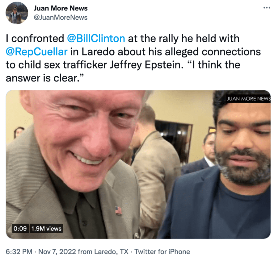 Elsewhere this week, in a connected development relating to a man who flew at least 26 times (and possibly many more times) on Jeffrey Epstein’s repugnant ‘Lolita Express’ private jet whilst numerous victims of sexual abuse were present also, a journalist named Juan Mendoza filmed himself confronting President Bill Clinton.
