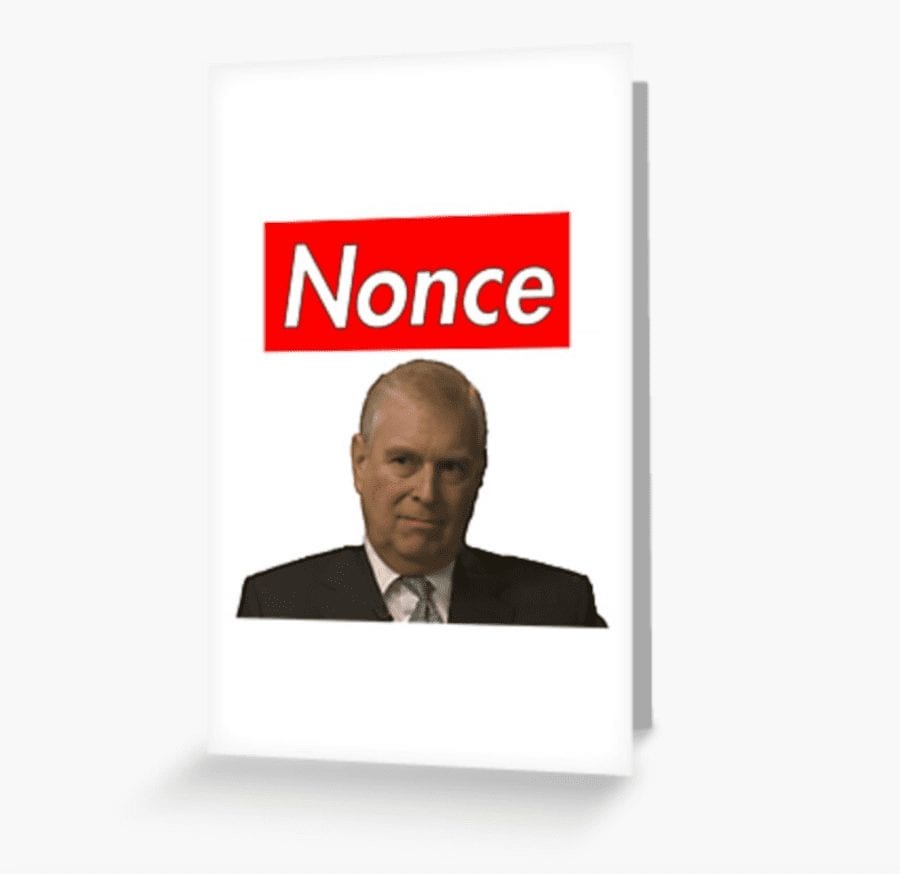 Meanwhile, elsewhere online a website named Redbubble is now selling digitally printed greeting cards featuring ‘Randy Andy.’ Priced at £2.38 each for one or £1.55 each if you buy fifty or more, the image is accompanied by the caption: “NONCE.” One or two have no doubt already been sent to Ghislaine Maxwell.